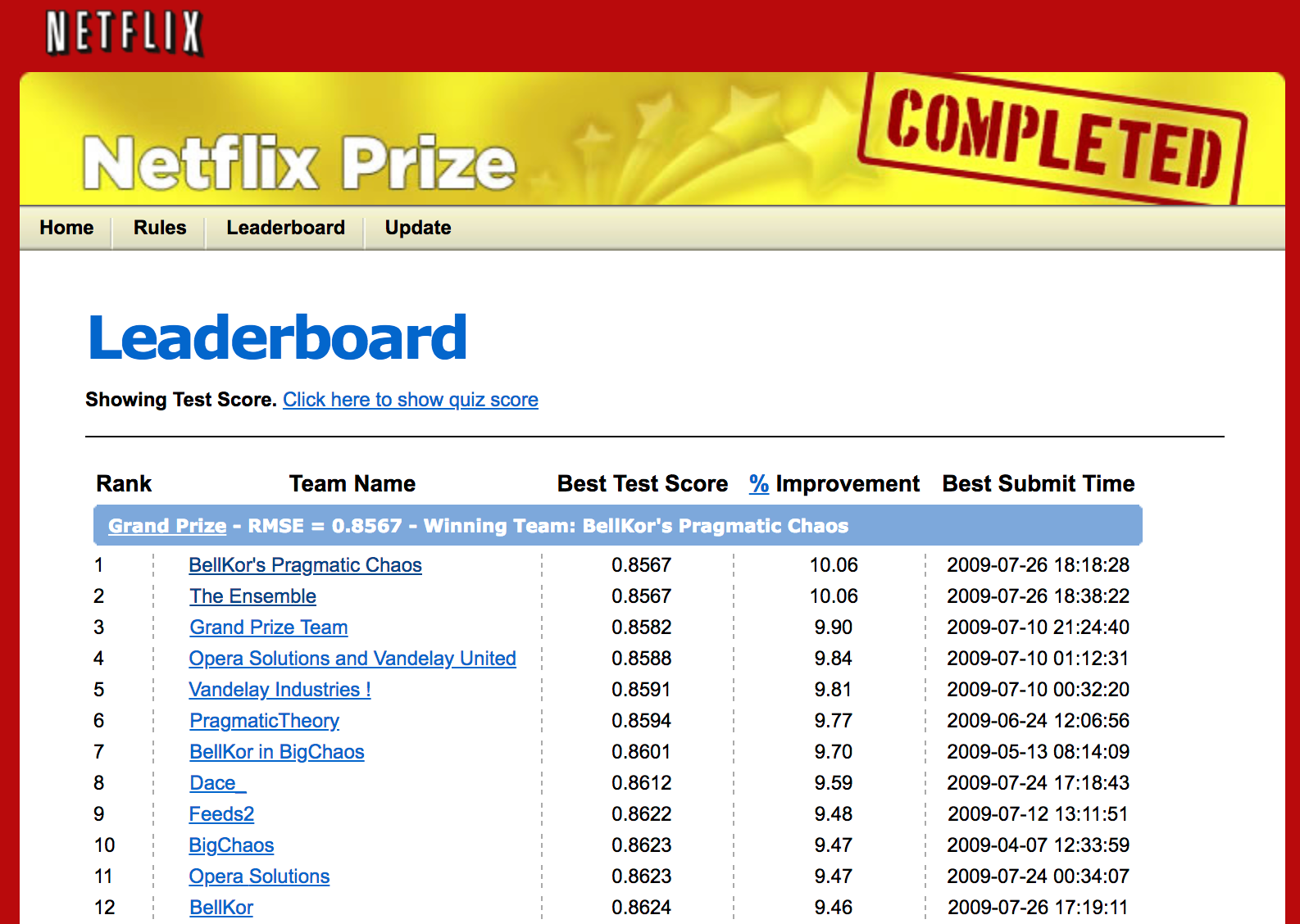 Winning algorithm was a hand-tuned ensemble of matrix factorization, neighborhood models with temporal dynamics, restricted Boltzmann machines and gradient boosted decision trees